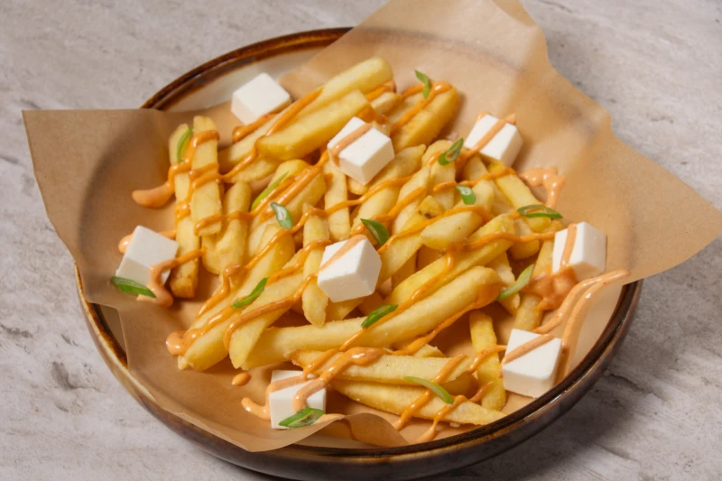 сыр фета, картофель фри, соус спайси, лук зеленый