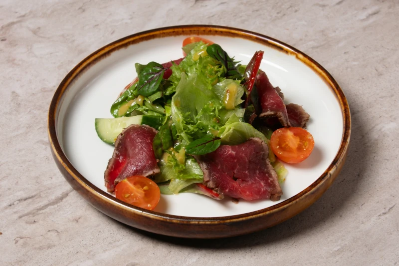 ростбиф, помидоры-черри, огурцы, заправка медово-горчичная, листья салата
